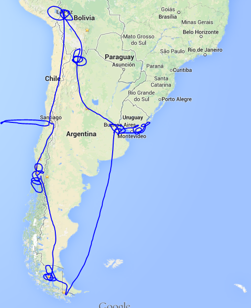 I tekst: Buenos Aires, Cordoba, Salta, Potosi, La Paz, Titicaca, Santiago, Påskeøya, Valdivia, Puerto Montt, Punta Arenas, Ildlandet, Ushuaia, Buenos Aires, Montevideo.