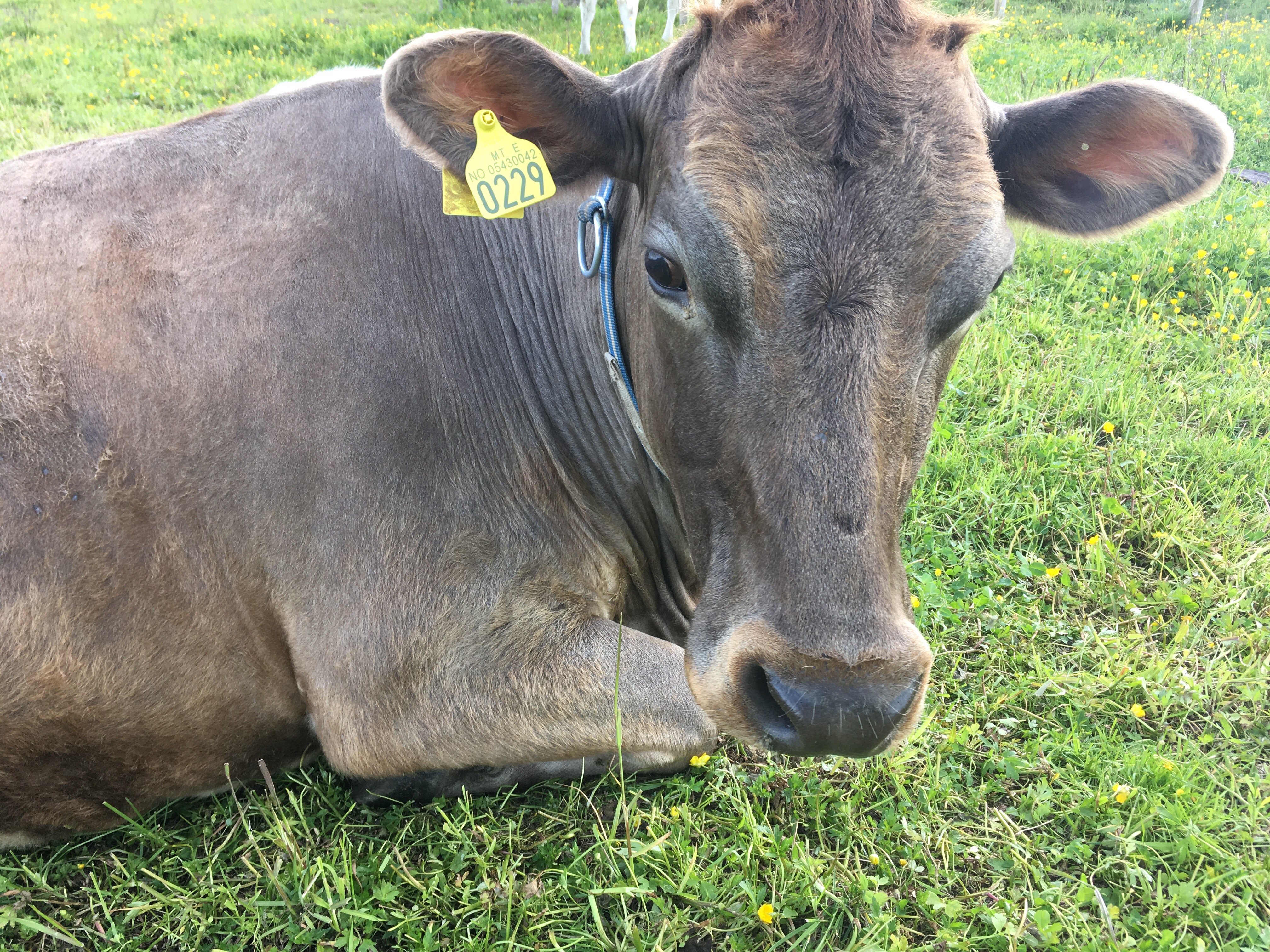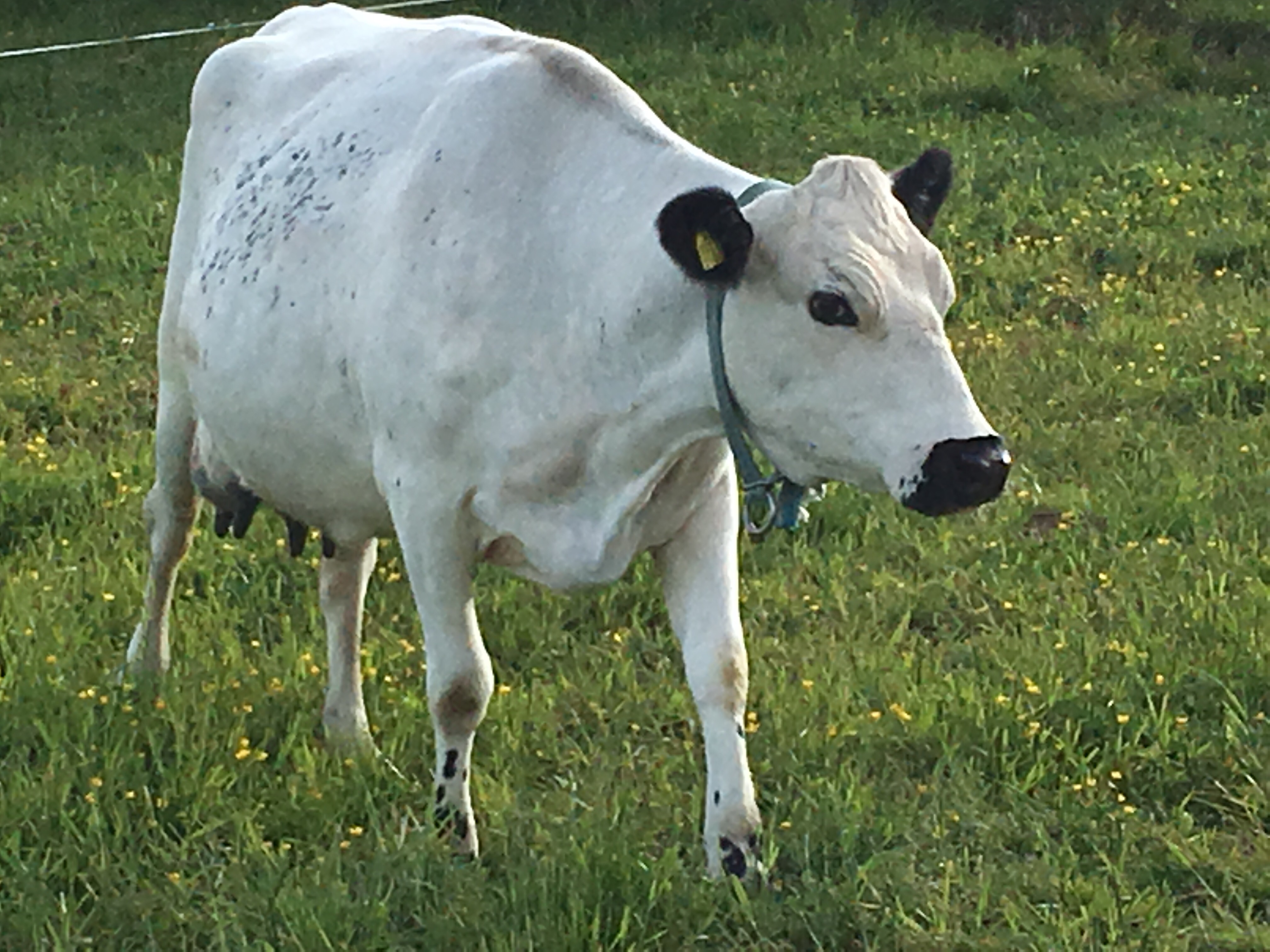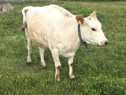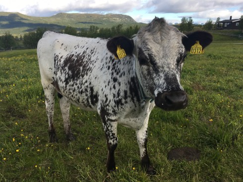 Også trønderfe med noen Jerseygener. Virker å være nummer to i hierakiet. Legg merke til sort mule og ører. Lettmelket og svært glad i kraftfor.