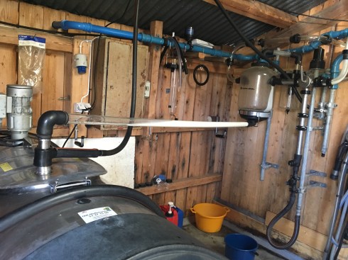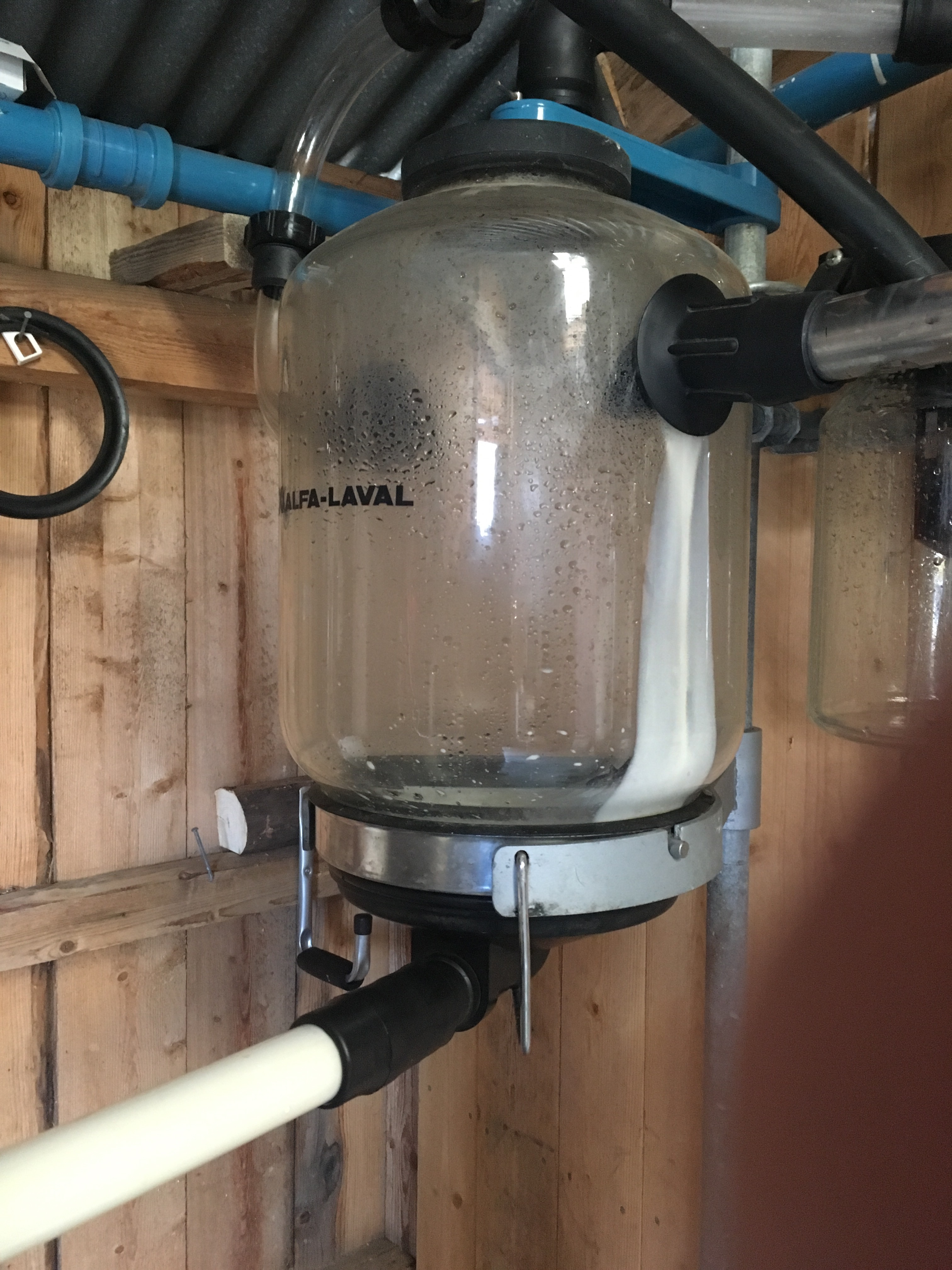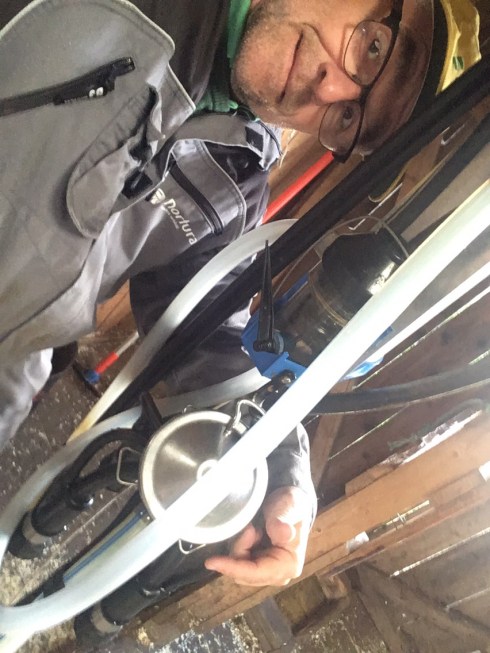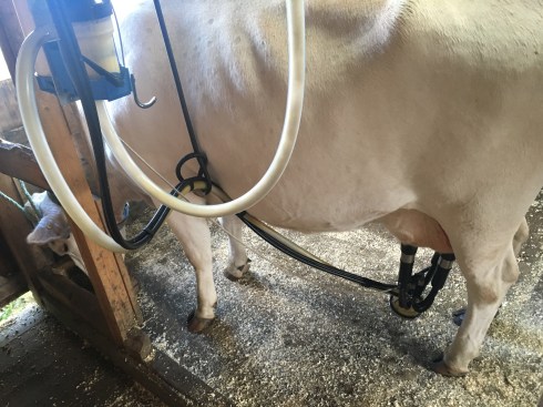 Vestlandsk fjordfe. Alltid nummer tre til melking. Småsparker litt når jeg fomler litt med melkemaskinen.